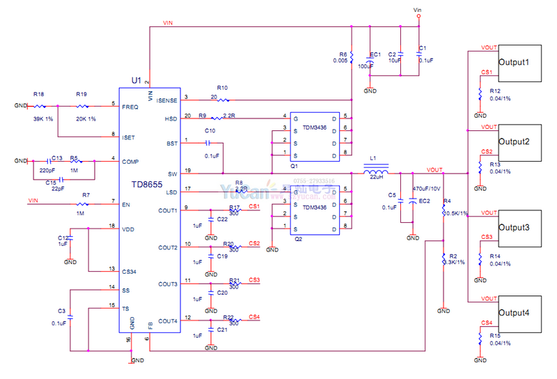 TD8655 40V/10A外置MOS 1/2/4路输出限流同步降压芯片