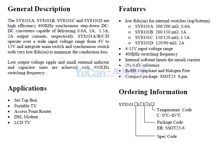 SY8101系列 400KHZ 0.6A/1A/1.5A/2A 16V synchronous step down