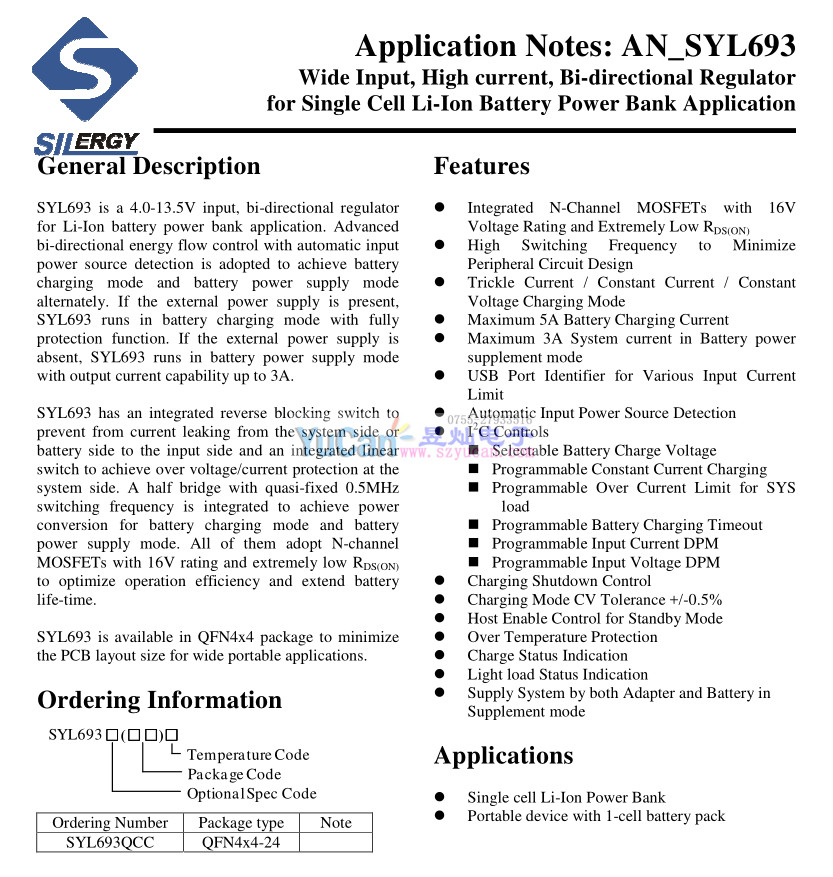 SYL693 4-13V 5A充 3A放 集DPM 输出限流 EN控制 I2C 及OTG功能的双灯指示移动电源IC