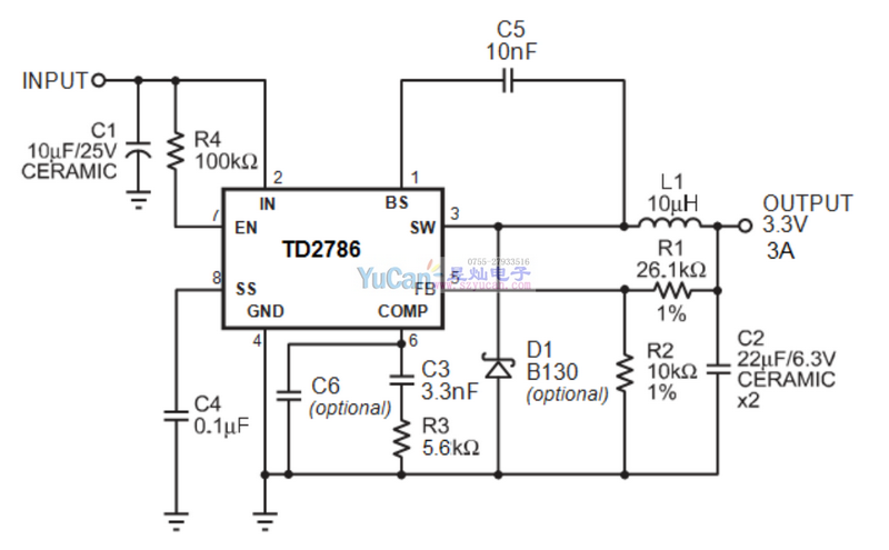 TD2786是同步整流降压调节器。该器件集成了功率MOS 可提供3A负载连续电流,输入电压在4.75V - 32V之间。电流模式控制提供快速瞬态响应和逐周期电流限制。软启动可防止在开机时涌流,在关机模式下,电源电流降至1uA。在PSM/PWM模式下,TD2786根据输出电流来调节,以实现从低到满负载的高效率运行。该芯片采用SOP8-PP封装,它提供了一个具有最小外部组件的非常紧凑的解决方案。