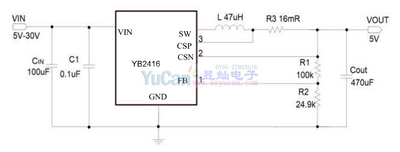 YB2416是支持高电压输入的同步降压电源管理芯片,在4-30V的宽输入电压范围内可实现3A的连续电流输出。通过调节FB端口的分压电阻,可以输出1.8V到28V的稳定电压.YB2416具有优秀的恒压/恒流(CC/C)特性.YB2416采用电流模式的环路控制原理,实现了快速的动态响应.YB2416工作开关频率为130kHz,具有良好的EMI特性。