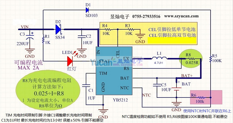 YB5212A是一种5-18V输入,2A电流可支持单节和双节锂电池的同步Buck锂离子电池充电器,适用于便携式应用。选择引脚方便多单元充电。800khz同步降压调节器集成MOS,超低导通电阻,实现高效、简单的电路设计。