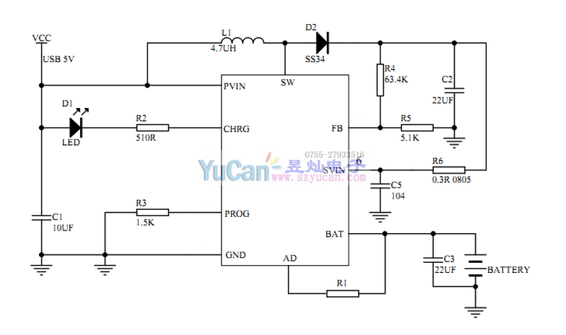 热反馈可对充电电流进行自动调节,以便在大功率操作或高环境温度条件下对芯片温度加以限制。充电电压始于7.2V,也可通过外围电阻调节。而充电电流可通过一个电阻器进行外部设置。当充电电流在达到最终浮充电压之后降至设定值1/10时,YB6502将自动终止充电循环
