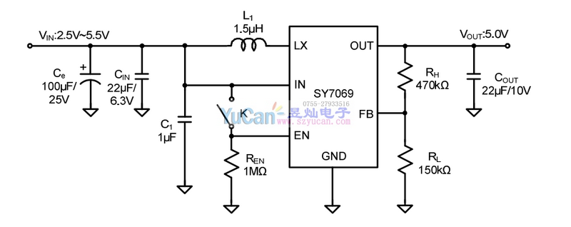 SY7069是一种高效率同步升压转换器,适用于单节锂离子或锂聚合物电池供电应用。它可以转换为2.5V输入电压为5.5V输出电压。主开关采用NMOS结构,同步开关采用PMOS结构。SY7069可以在关机模式下断开输出和输入。当输入电压超过规定的输出电压时SY7069自动进入旁路模式。