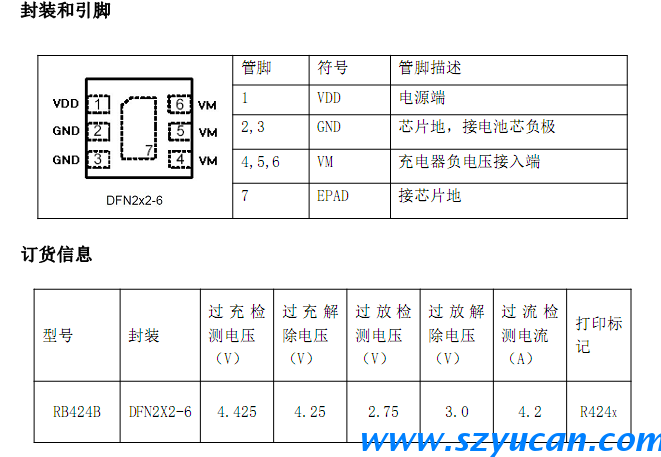 路等各项保护等功能,确保电芯安全,高效的工作。RB424B采用 DFN2X2-6封装,外围只需要一