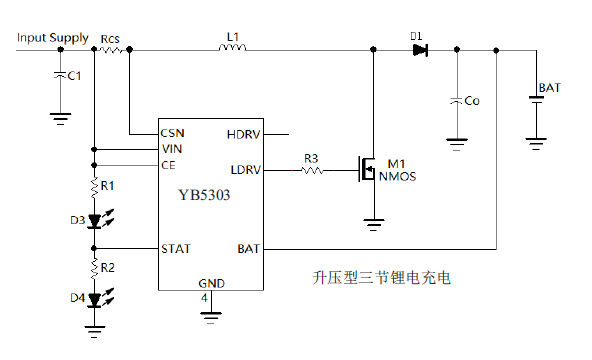 YB5303是一款工作于2.7V到6.5V的PFM升压型三节锂电池充电控制集成电路。YB5303采用恒流和准恒压模式(Quasi-CVM)对电池进行充电管理,内部集成有基准电压源,电感电流检测单元,电池电压检测电路和片外场效应晶体管驱动电路等,具有外部元件少,电路简单等优点。当接通输入电源后,YB5303进入充电状态,控制片外N沟道MOSFET导通,电感电流上升,当上升到外部电流检测电阻设置的上限时,片外N沟道 MOSFET截止,电感电流下降,电感中的能量转移到电池中。当电感电流下降到外部电流检测电阻设置的下限时,片外N沟道MOSFET再次导通,如此循环。当BAT管脚电压第一次达到内部设置的12.6V(典型值时,YB5303进入准恒压充电模式,以较小电流对电池充电。只有当BAT管脚电压第二次达到12.6V时,充电过程才结束,片外N沟道MOSFET保持截止状态。当BAT管脚电压下降到再充电阈值时,YB5303再次进入充电状态。 YB303最高工作频率可达1MHz,工作温度范围从-40℃到+85℃。当电池电压低于输入电压或电池短路时,YB5303在片外N沟道MOSFET和P沟道MOSFET的共同作用下,用较小电流继续对电池充电,对电池起到保护作用。其他功能包括芯片使能输入,状态指示输出端等。 YB5303采用8管脚的SOP8封装。